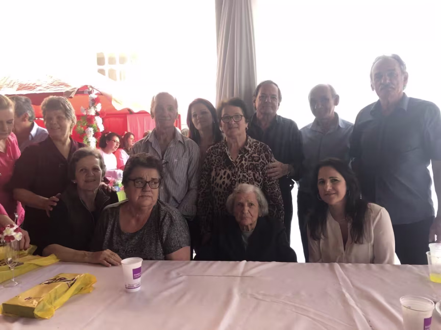 Com entusiasmo, a família Trainotti participou da festa. A matriarca, Palmira Tomazoni Trainotti, 98 anos, esteve acompanhada dos 13 filhos, genros, noras, netos e bisnetos, e pode comemorar a chegada da nova idade.