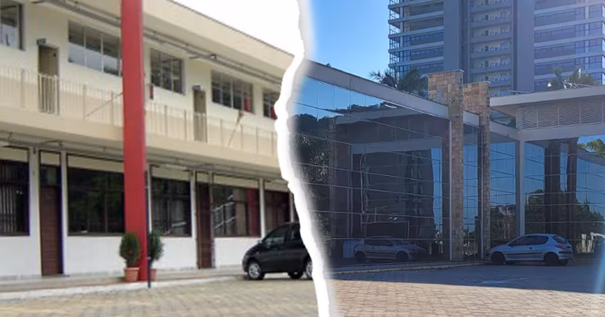 Arraste a seta e confira a comparação de fotos da faculdade antes e depois da reforma do prédio: