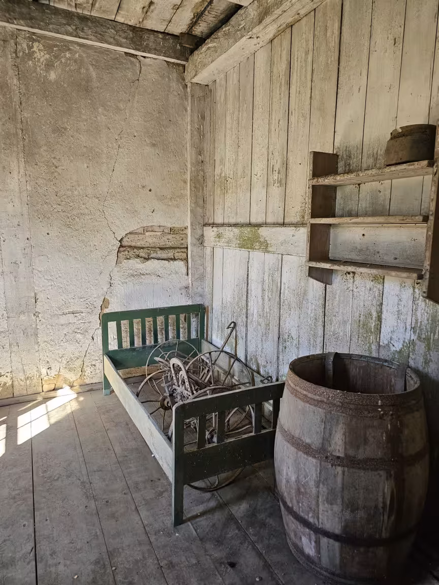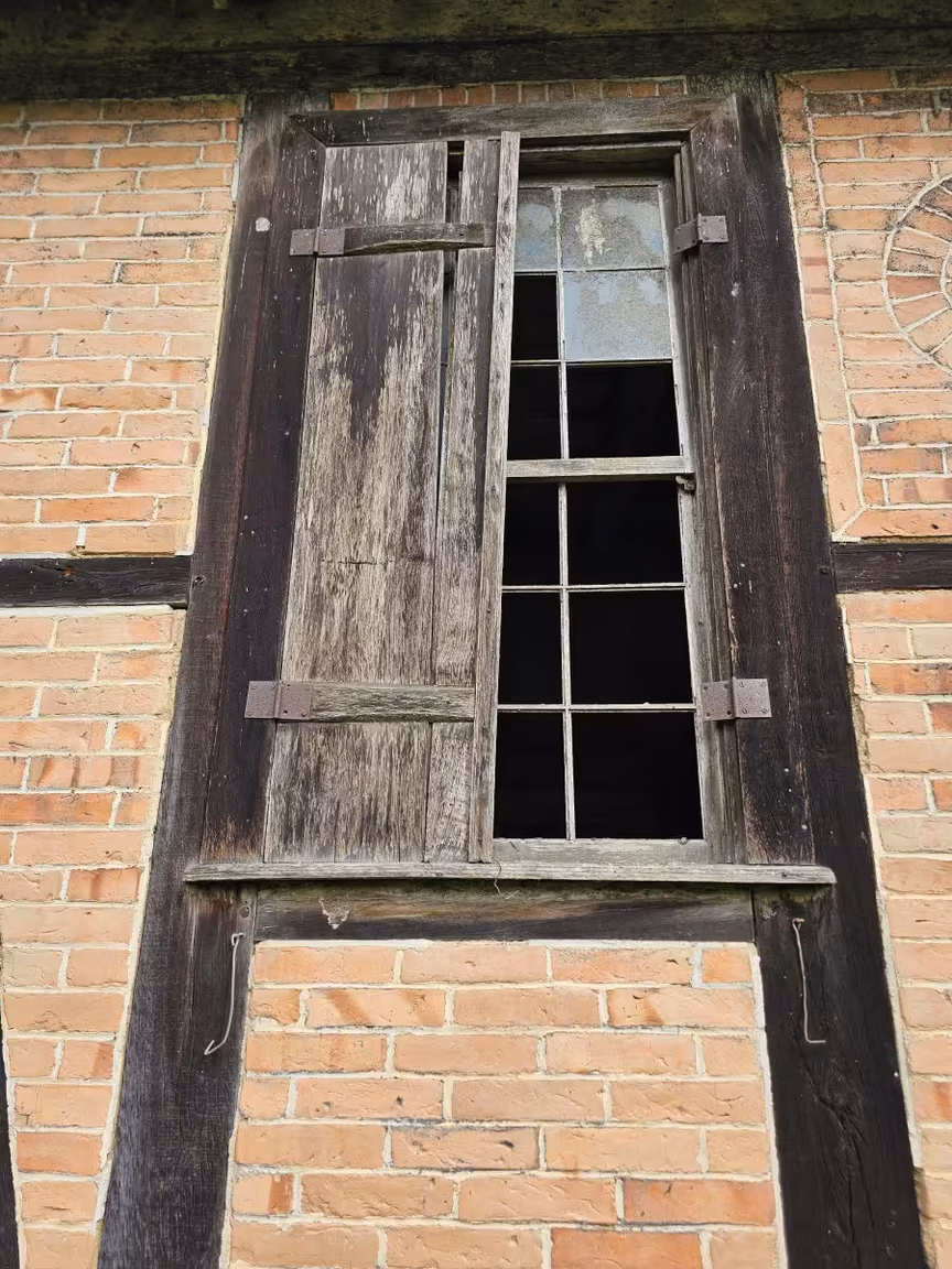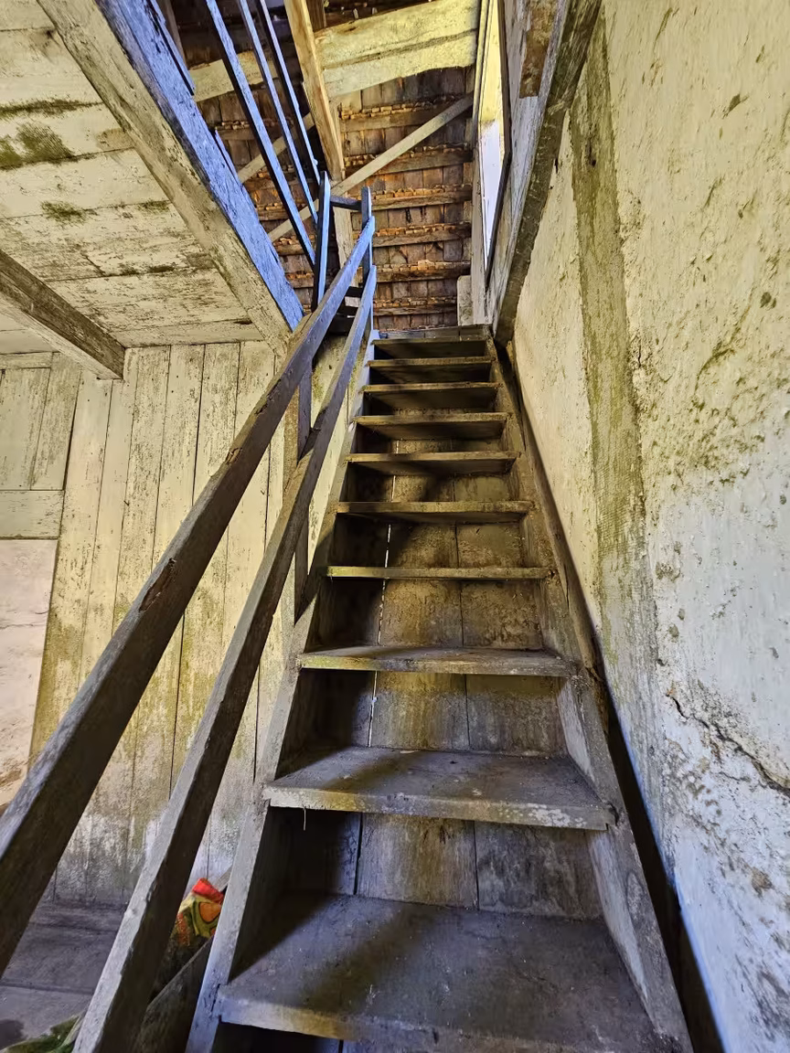 Os desenhos circulares feitos com tijolos estrategicamente dispostos embelezam ainda mais a casa, conferindo-lhe um visual único. No interior, alguns objetos do passado ainda podem ser encontrados, enquanto o assoalho requer cuidado ao caminhar, e a escada que leva ao sótão precisa ser subida com cautela.