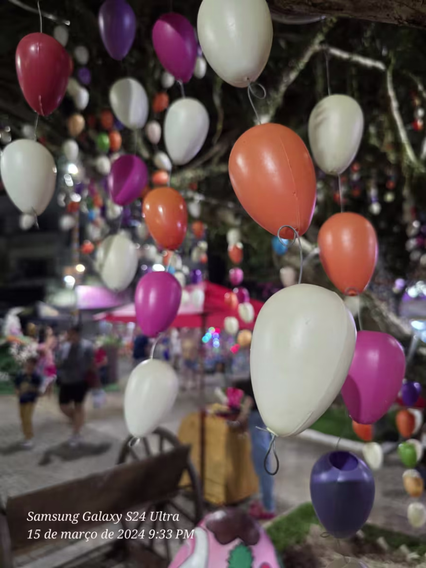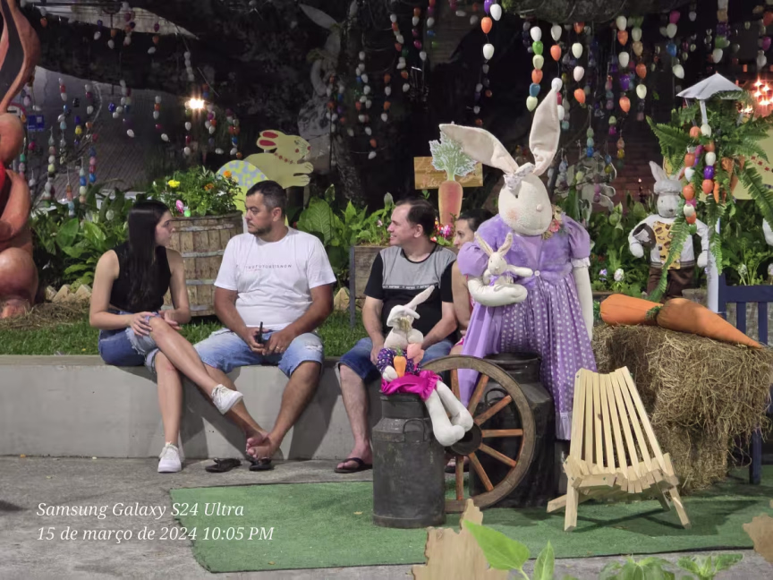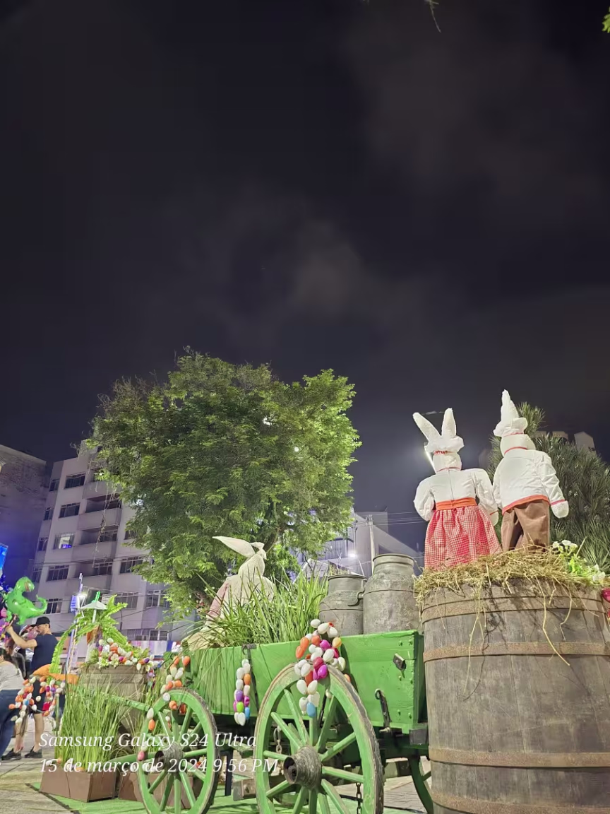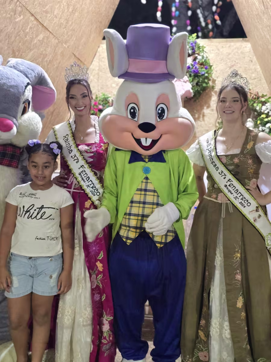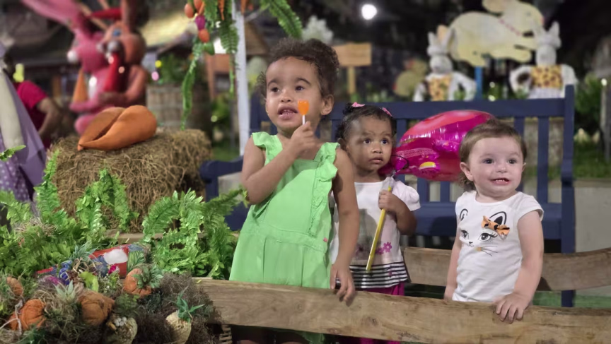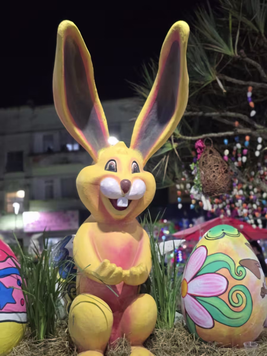 A atmosfera festiva então envolveu a praça, que se transformou com o encantador Chalé da Turma do Coelho e uma decoração vibrante repleta de ovos pintados.