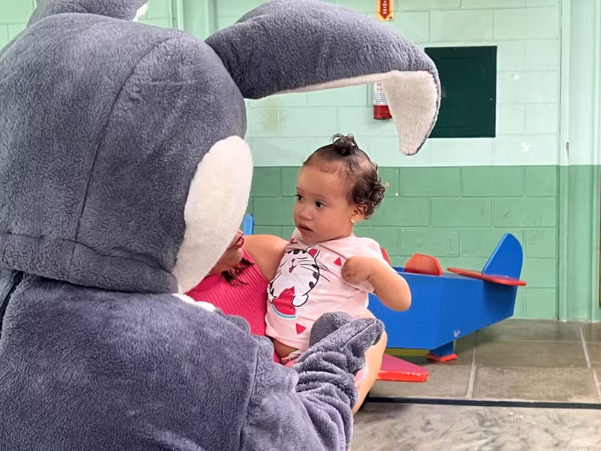 O coelhinho da Páscoa apareceu presencialmente em algumas instituições para visitar as crianças.