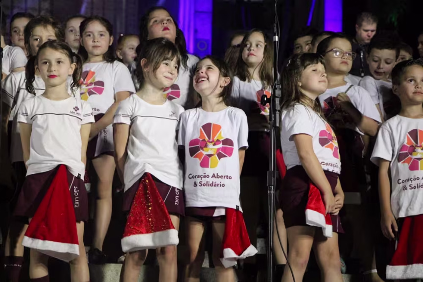 Os mais de 300 alunos do Ensino Fundamental do colégio São Luiz se apresentaram nas escadarias da Igreja Matriz, em Brusque, na noite desta quarta-feira, 7. A cantata de Natal emocionou o público presente.