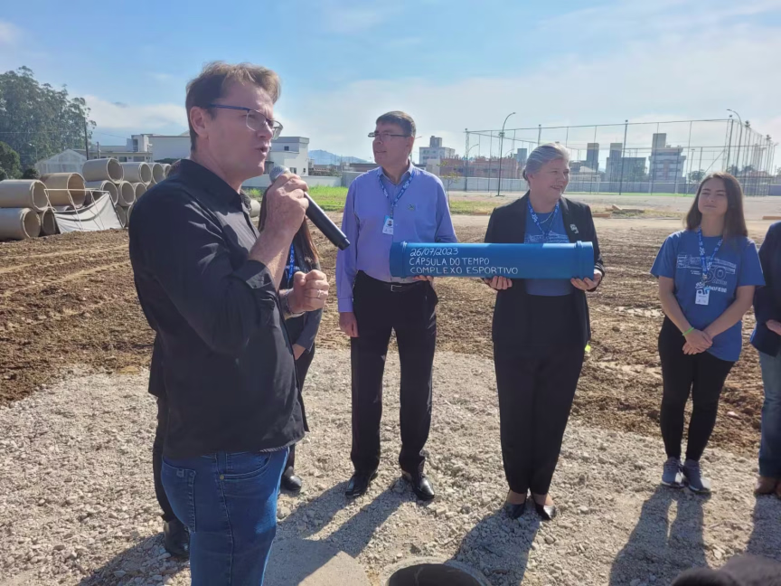 Em evento na manhã desta terça-feira, 26, foi enterrada uma cápsula do tempo do complexo esportivo da Unifebe. Na estrutura, foi colocado o jornal do dia, um crucifixo e outros itens.