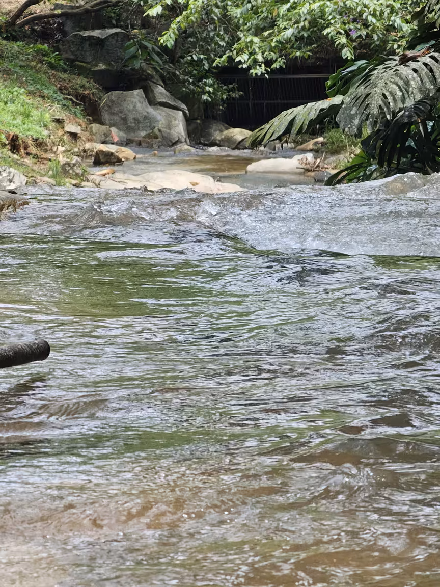 O cenário, habitado por animais que percorrem livremente entre uma profusão de árvores, destaca-se pela presença imponente da cascata, verdadeira protagonista do ambiente.