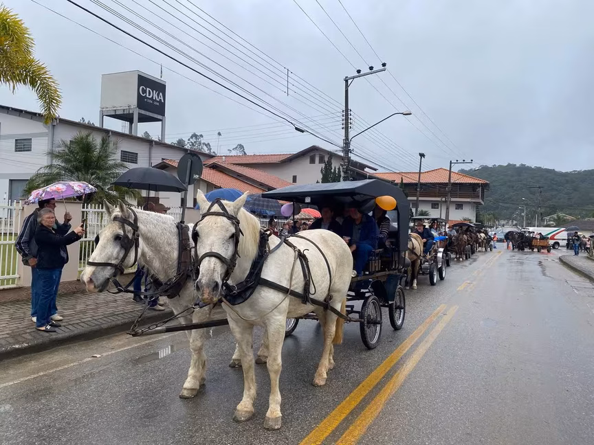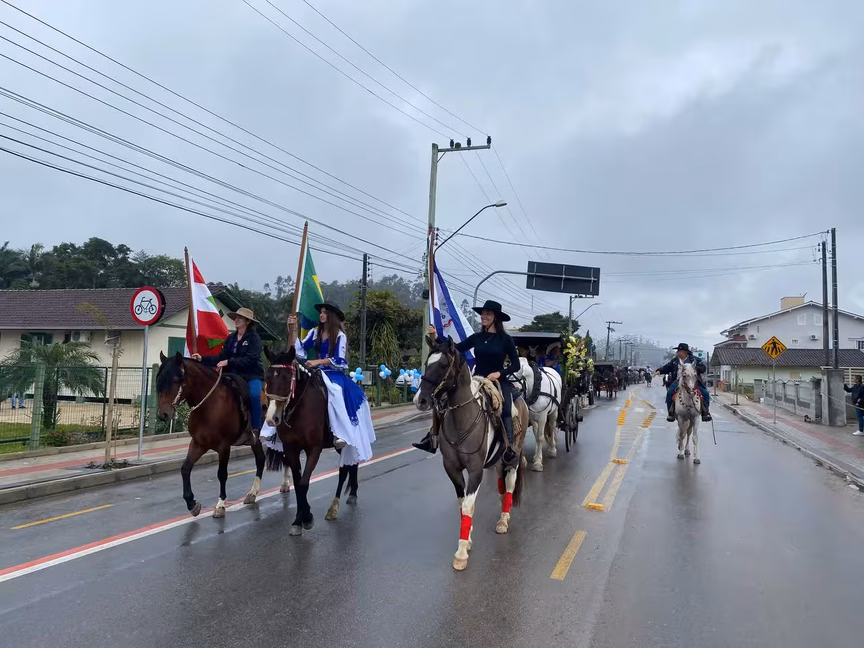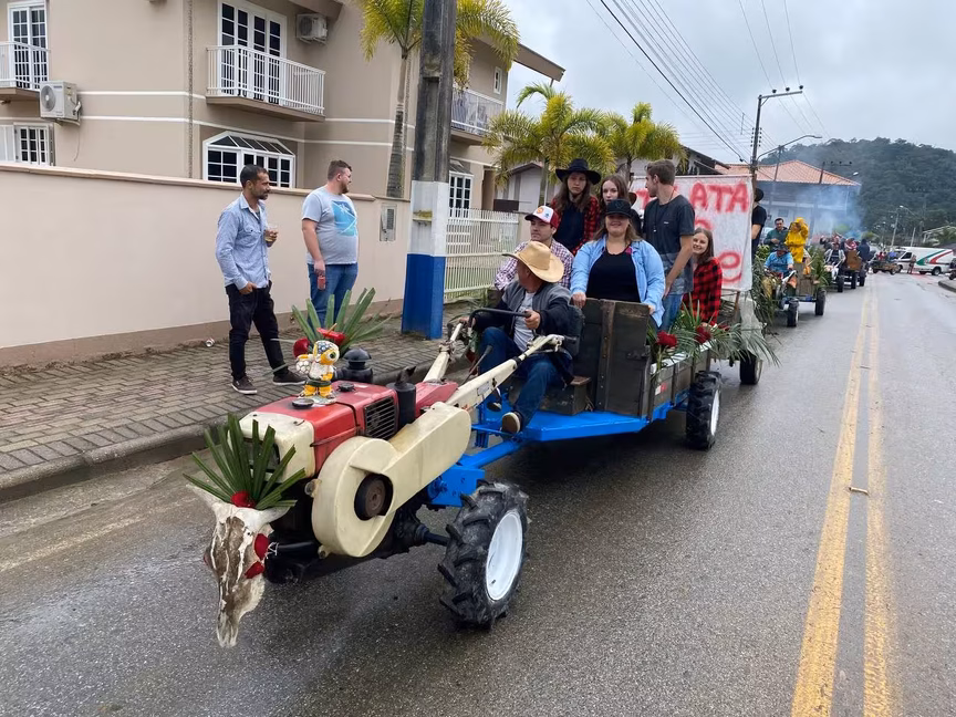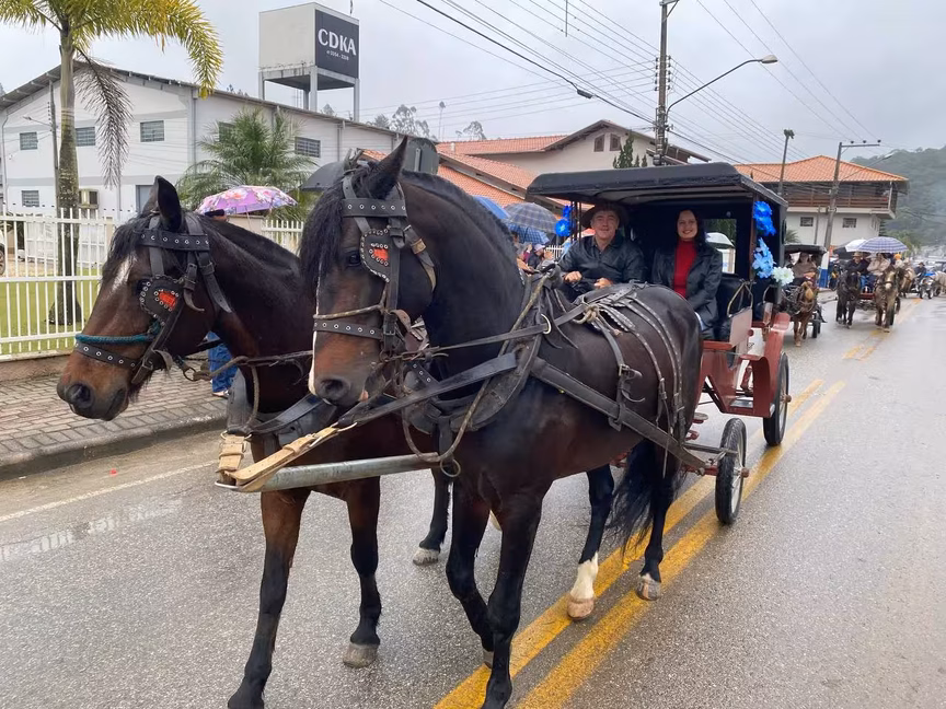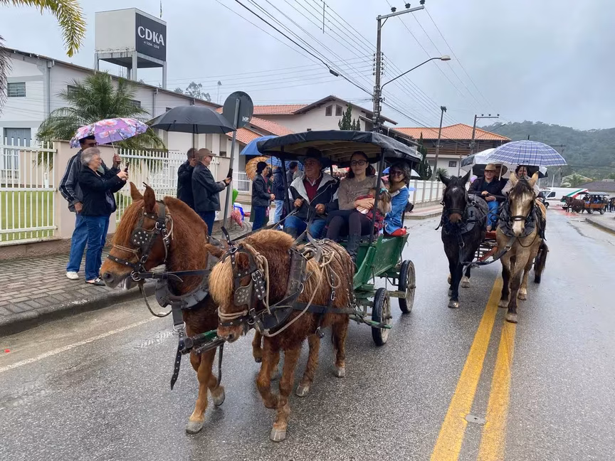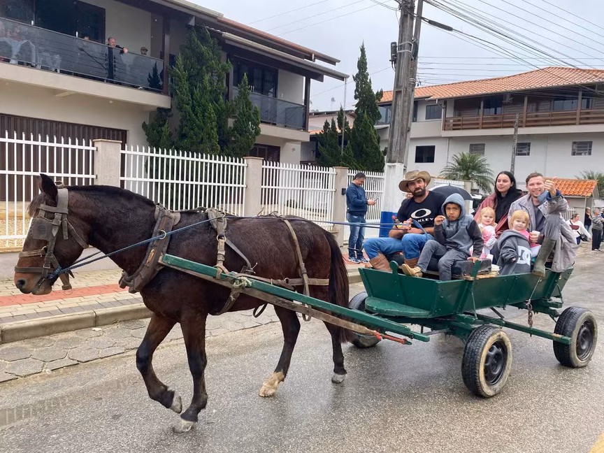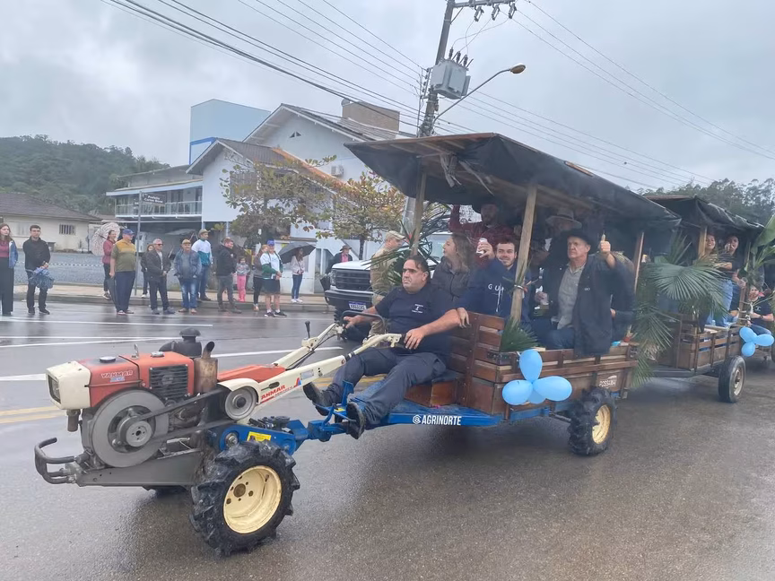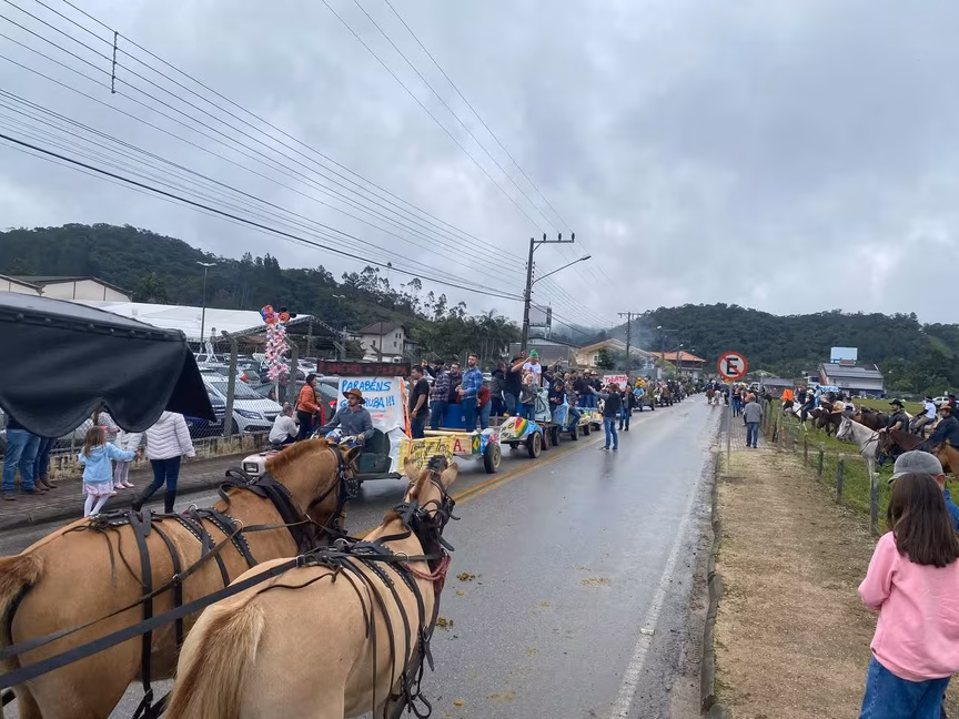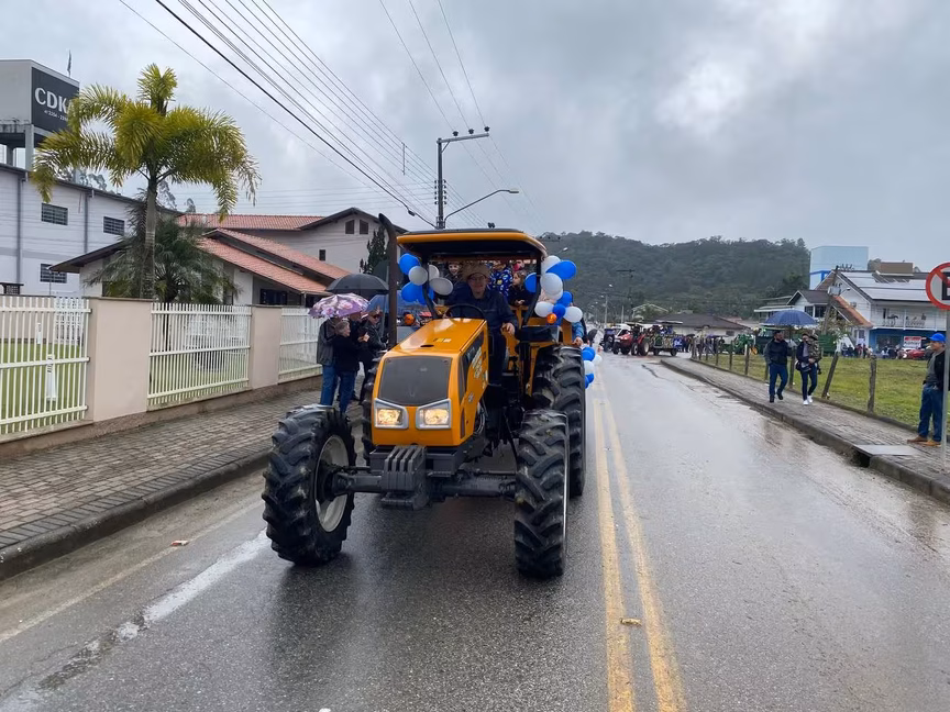 A cavalos, em tobatas, carroças e tratores, diversas pessoas participaram do Desfile tradicional dos Colonos na manhã deste domingo, 5. A ação fez parte da programação da Festa da Integração, em Guabiruba, que ocorre neste fim de semana no salão da igreja São Cristóvão, no bairro Aymoré.