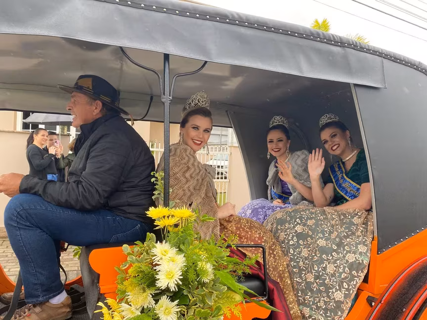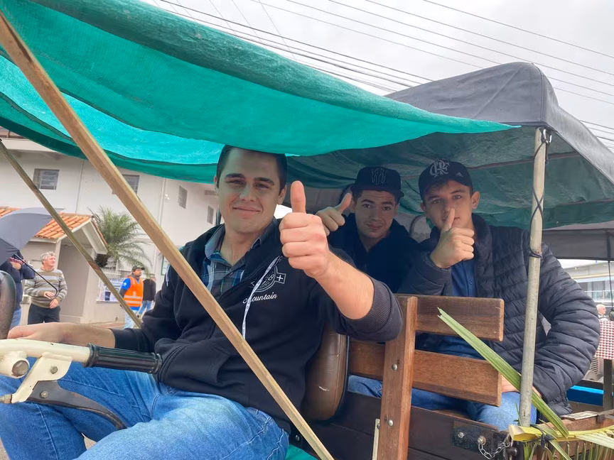 Com saída da Prefeitura, parte da rua Prefeito Carlos Boos foi fechada para o desfile. Ao longo da via, familiares e amigos aguardavam pelos colonos nas calçadas, que movimentaram a região mesmo sob chuva fraca.