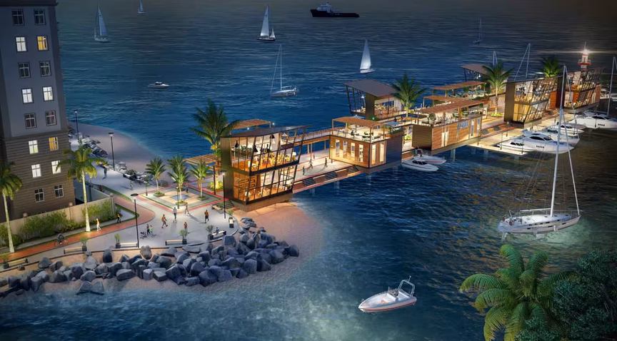 O local contará com uma plataforma construída sobre estacas e aterro, medindo 220 metros de comprimento por 30 metros de largura, em uma área total de 6.600m², com uma parte na orla e outra sobre o mar. O equipamento contará com unidades comerciais, espaços de lazer e estacionamento de embarcações.