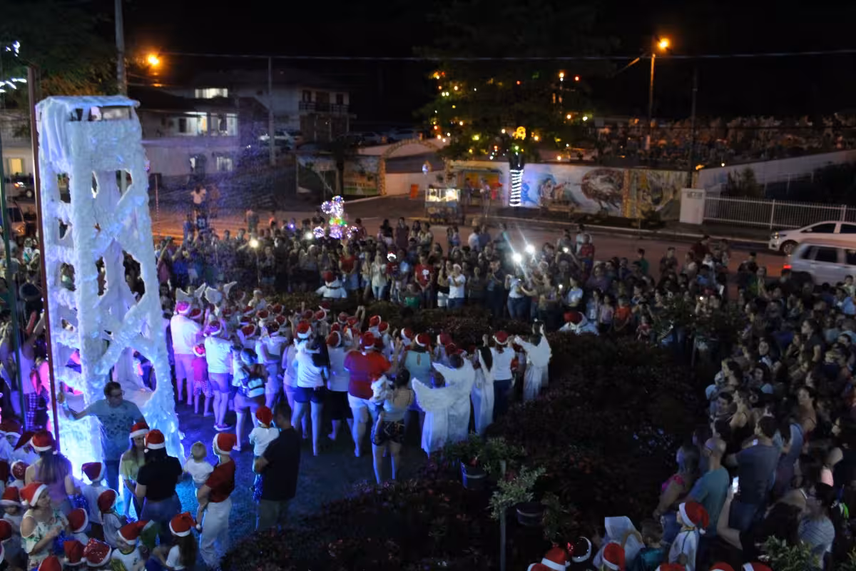 Para embalar a noite, os pequenos fizeram apresentações natalinas com música e dança para a comunidade, que fez questão de aplaudir os alunos das escolas do município. A prefeitura montou uma estrutura para distribuir “neve” durante as coreografias.