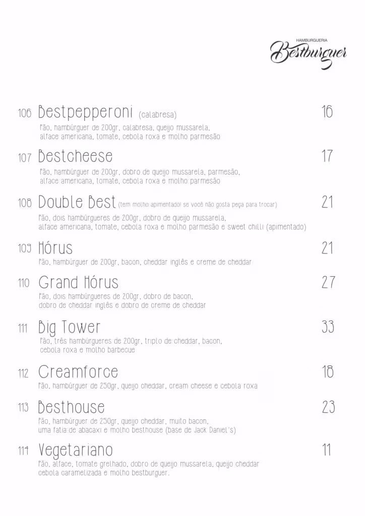 Criada em 12 de dezembro 2015, pelos amigos André Vinícius Tôndolo e Peterson do Nascimento, a Bestburguer Hamburgueria, oferece uma grande variedade de hamburgueres gourmet, que vem agradando os mais exigentes paladares de Brusque e região. Confira abaixo o cardápio e peça já o seu! A hamburgueria fica aberta de domingo a quinta-feira, das 18h30 às 23h e sábado das 19h à meia-noite.