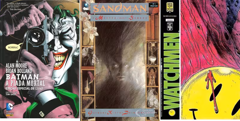 Ambos têm algo em comum com A Piada Mortal: a assinatura do onipresente Alan Moore. Mudam os desenhistas: no primeiro, David Lloyd. Na segunda, Dave Gibbons. V de Vingança passou a fazer parte do imaginário da Cultura Pop de tal forma que a máscara de Guy Fawkes foi adotada pelos Anonymous.