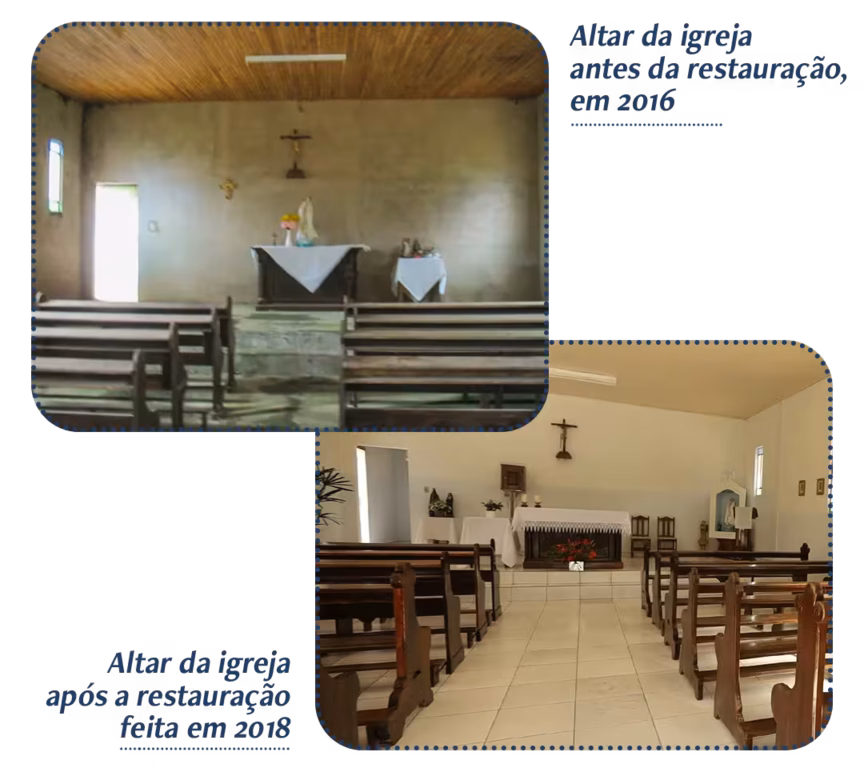 Dispostos a dar um novo rumo para a igreja, Tarcísio e Maria de Fátima começaram a limpeza. O ano era 2016. O casal limpou por dentro e lavou também a imagem de Nossa Senhora de Fátima, padroeira da igreja. Aos poucos, o templo foi renascendo. A igrejinha abandonada foi ganhando vida. Um passo de cada vez, sua estrutura foi sendo restaurada. Foi toda pintada com a ajuda do filho e da nora de Tarcísio. Os bancos foram improvisados para as missas continuarem a ser celebradas no local. Toda a restauração da igreja foi possível graças à ajuda da comunidade.