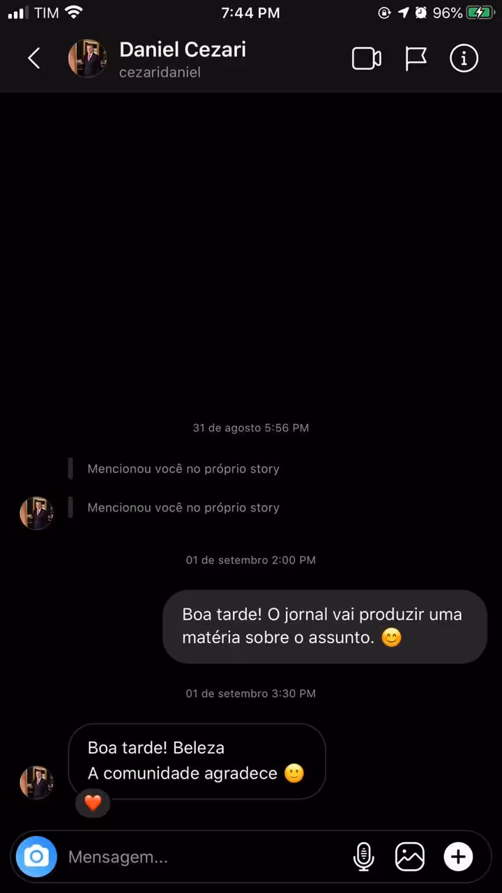 E mais: nos comentários da publicação, uma conta chamada de “cezaridaniel” afirma que o jornal “fez corpo mole” para publicar matéria sobre os problemas na rua José Bodenmuller, no Águas Claras. E o mais grave: diz categoricamente que O Município tentou “cobrar financeiramente para publicar”. Mentira. Buscamos em nossos registros e a verdade está lá: Daniel nos procurou dia 31/08 pelo Instagram. Respondemos a ele no dia seguinte informando que faríamos a matéria. E dia 11/09, conforme prometido, ela estava publicada. Temos prints que comprovam. Nem sempre o processo de publicação é tão rápido quanto os leitores gostariam já que, por óbvio, temos uma série de matérias em produção e há o tempo necessário para correta apuração. E mais: o jornal, em hipótese alguma, cobra por matérias. Repudiamos acusações do tipo. Para quem quiser conferir, a matéria está disponível no site com a reclamação de moradores e o contraponto da prefeitura, com o título “Moradores cobram da Prefeitura de Brusque pavimentação de rua no Águas Claras”. Uma das fotos da matéria, inclusive, traz faixa feita por morador com a frase “Prefeitura arrecadou dinheiro e não faz asfalto”.