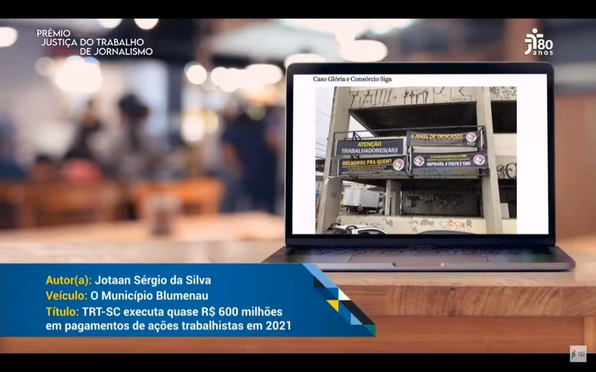O jornal O Município Blumenau recebeu o Prêmio Justiça do Trabalho de Jornalismo na noite desta terça-feira, 5. A reportagem de Jotaan Silva sobre a atuação do Tribunal Regional do Trabalho de Santa Catarina (TRT-SC) no cenário das decisões de dívidas trabalhistas foi destaque nacional.