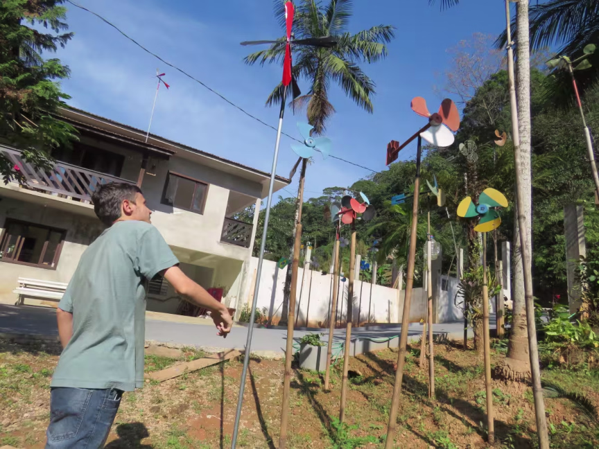 Os materiais necessários para o hobby do jovem ficam armazenados em uma oficina improvisada. Nela, além de fabricar novos cata-ventos, testando materiais diferentes, ele faz a manutenção dos itens avariados. Próximo dali, mantêm criações de galinhas de espécies variadas, além de gansos.