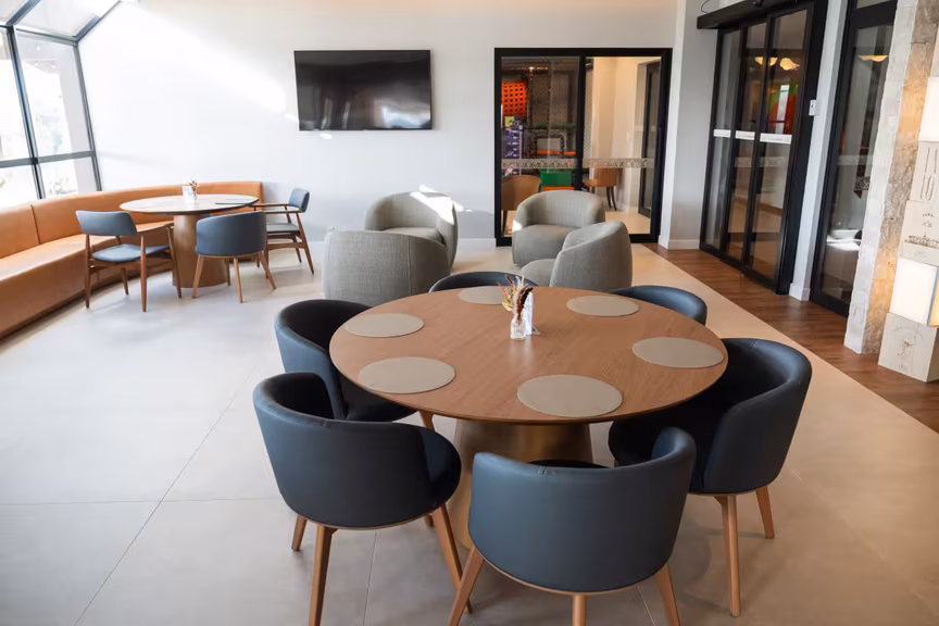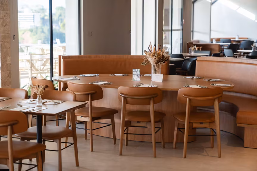 Há um lounge para cafés e vinhos, bar para drinks mais informais e área principal para jantares românticos. Um espaço kids anexo atende à demanda de famílias, enquanto o conforto acústico foi reforçado em todo o salão.