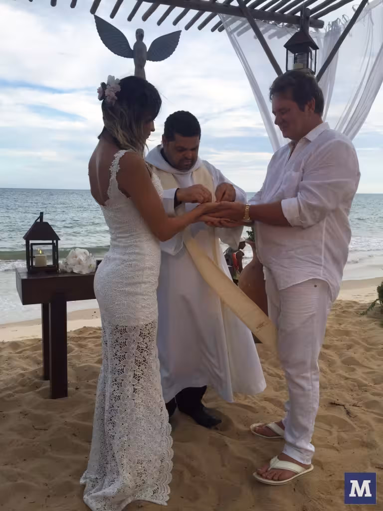 A cerimônia, para familiares e amigos mais chegados, aconteceu na tradicional e luxuosa Pousada Bahia Bonita e teve como cenário o pôr do sol da paradisíaca praia baiana.