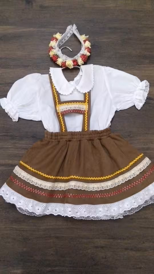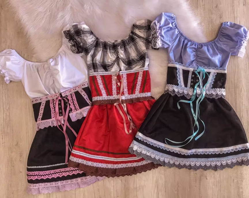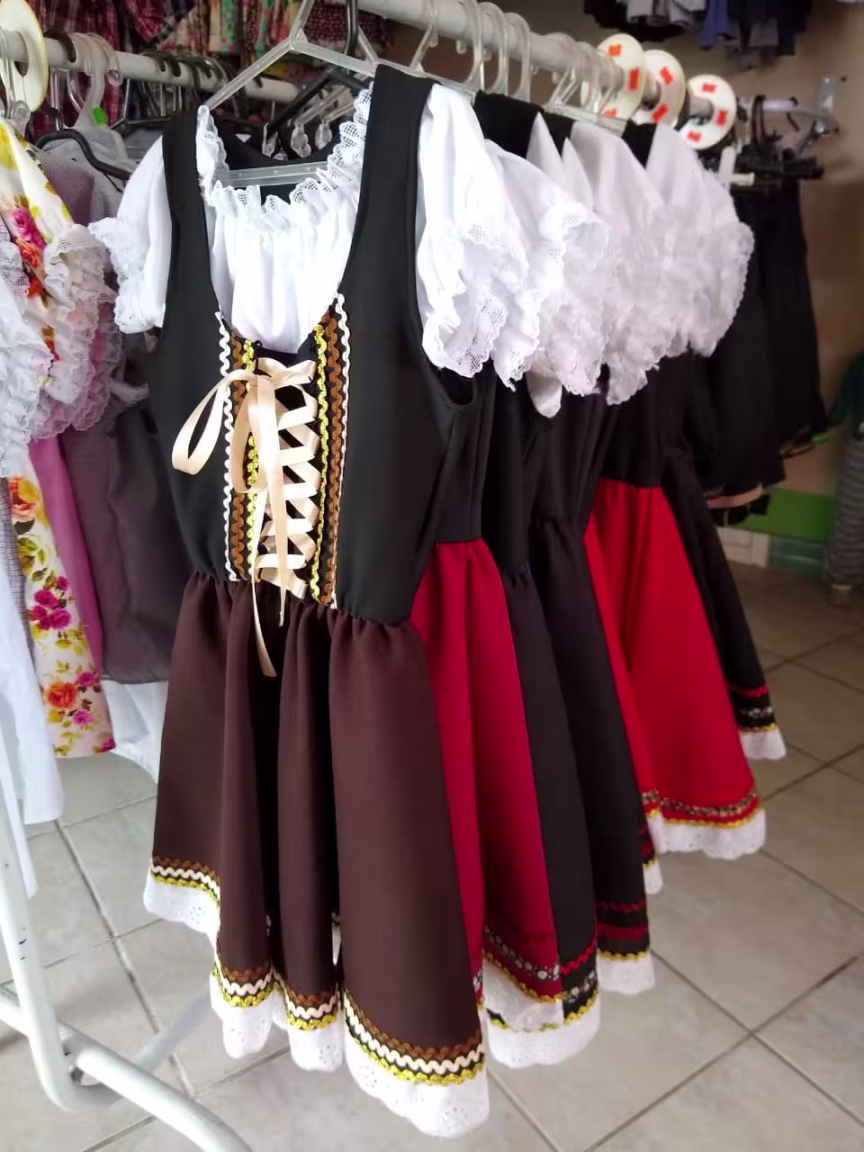 Na Maria Carolina Clothing estão disponíveis modelos de frida que incluem corpete, blusa e saia. Também tem blusas brancas, coloridas e xadrez por R$ 39. Já o traje completo custa R$ 120 no cartão. Se o pagamento for à vista no dinheiro, o valor é R$ 100.
