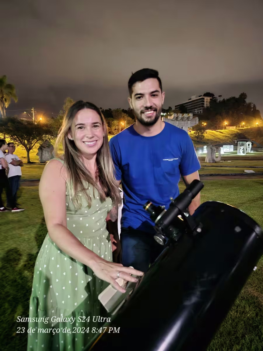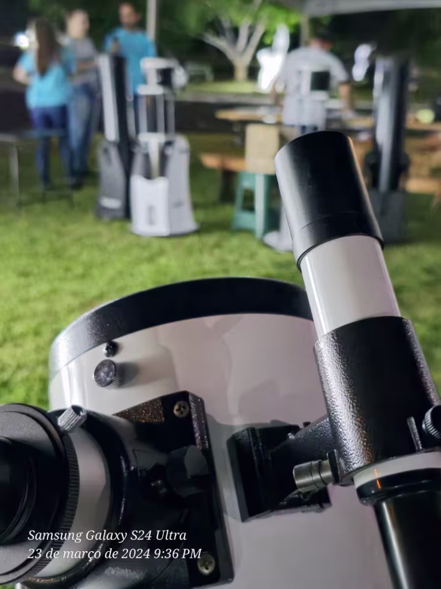 Telescópios potentes foram disponibilizados para os visitantes, proporcionando às famílias uma experiência única de observação.