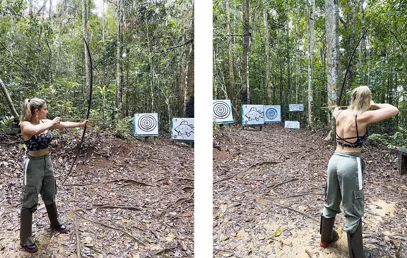 Foi uma divertida brincadeira com artefatos originais da etnia Waimiri-Atroari em busca de prática e técnica para acertar a pontaria e o alvo. Depois de um pouco de paciência e treino fica gostosa a brincadeira.