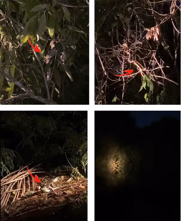 Nosso guia com uma lanterna de luz forte procurava pelos animais entre as árvores, a habilidade de achar foi um show a parte! Encontramos alguns bichos, casal de pássaros que não me recordo o nome, duas cobras, filhotes de jacarés, coloquei flechas para facilitar: