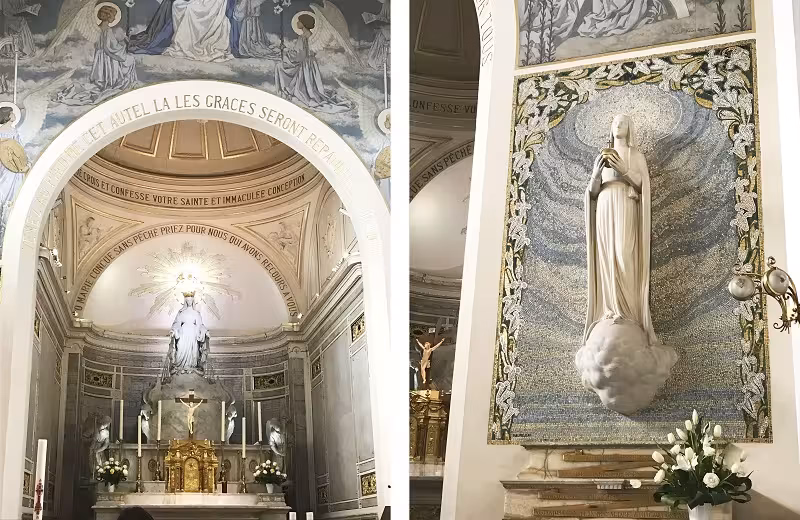 Essa é a minha queridinha da cidade Luz, o endereço sei de memória: 140 Rue du Bac. Foi em 1830, quando a Santíssima Virgem Maria apareceu para uma de suas irmãs na capela, a Santa Catarina Labouré. Deu-lhe a Medalha Milagrosa, em que se acredita ter o poder de fazer milagres e receber a cura. Assim, a capela e a Medalha Milagrosa ganharam fama e é local de adoração de milhões de fiéis que vem pedir e agradecer.