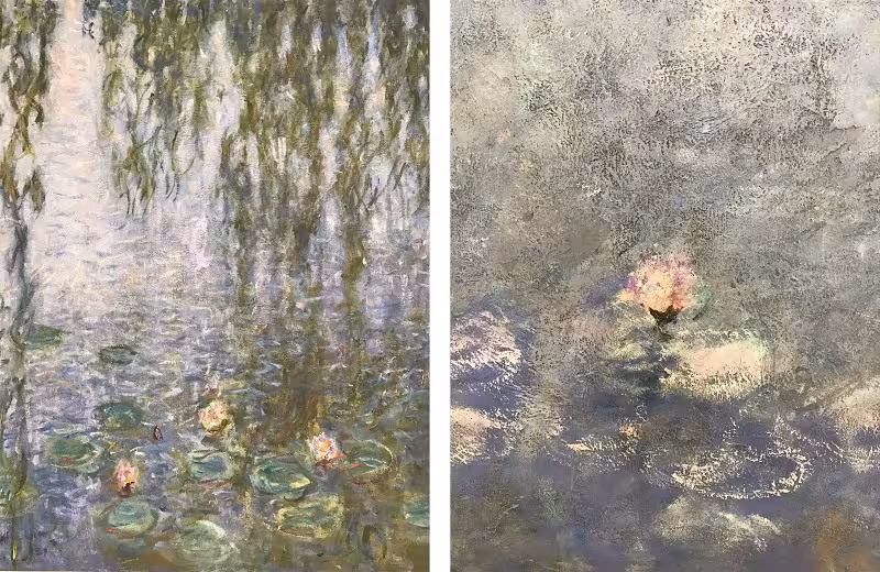 A exposição das Ninféias representa as plantas aquáticas do lago do jardim da casa de Monet. São 22 painéis retangulares de 2 metros de altura. Como são muito grandes não foi possível pintar em uma única tela, assim, para cada “quadro” foi preciso unir mais de uma tela. O “quadro” maior tem 17 metros de comprimento, e o menor tem 6 metros.