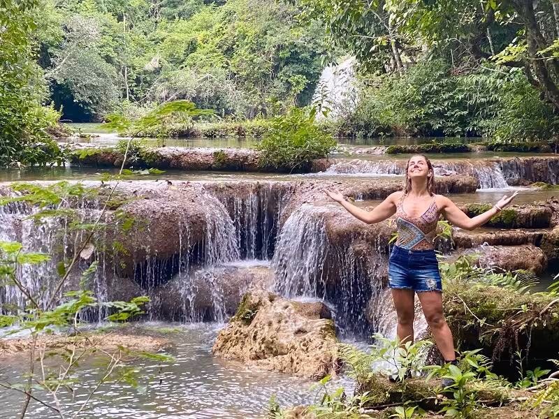 A cor da água é incrivelmente azul, eu fiquei encantada com tanta beleza.