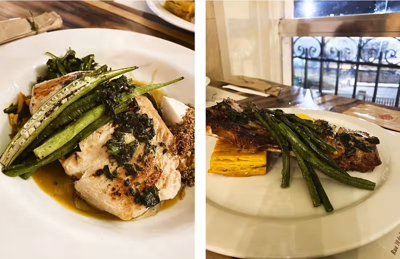 Não pedimos entrada pois fizemos o antes (fica quase que um do lado do outro, dois minutos pé) , então fomos direto ao prato principal. Esquerda: Pirarucu (peixe) fresco grelhado na chapa a carvão com baião cremoso de feijão manteguinha e arroz vermelho, coalhada artesanal "dukkah" legumes tostados e tucupi. Direita: Supreme de tambaqui com castanhas, macaxeira recheada com queijo coalho e farofa urani.
