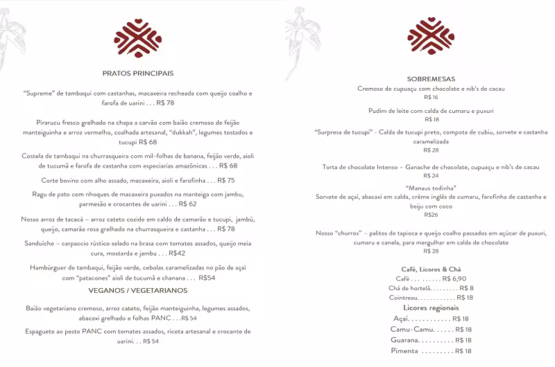 A cardápio está encarregado da renomada chef que mescla pratos contemporâneos com elementos da gastronomia amazonense.