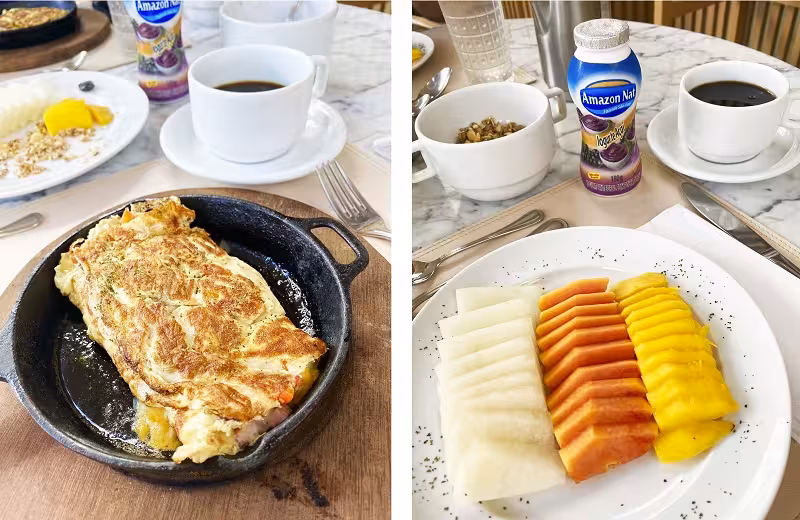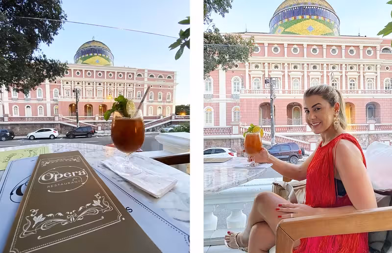 Restaurante Ópera: fica localizado dentro do hotel Juma Ópera e os não hospedes podem fazer reservas para jantar. Iniciamos o nosso último jantar na cidade na parte externa, com um drink delicioso e apreciando a vista incrível do Teatro Amazonas.