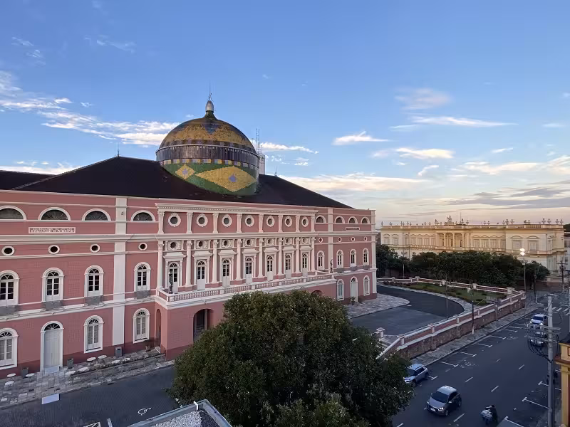 : hotel bom e com ótimo preço, longe do centro, porém perto do restaurante que havíamos reservado para a primeira noite. Se fosse para ficar mais dias e turistar acredito não ser o ideal. : maravilhoso em todos os quesitos, localização, gastronomia, serviços, e claro a vista linda que se tem do terraço da cúpula do Teatro Amazonas.