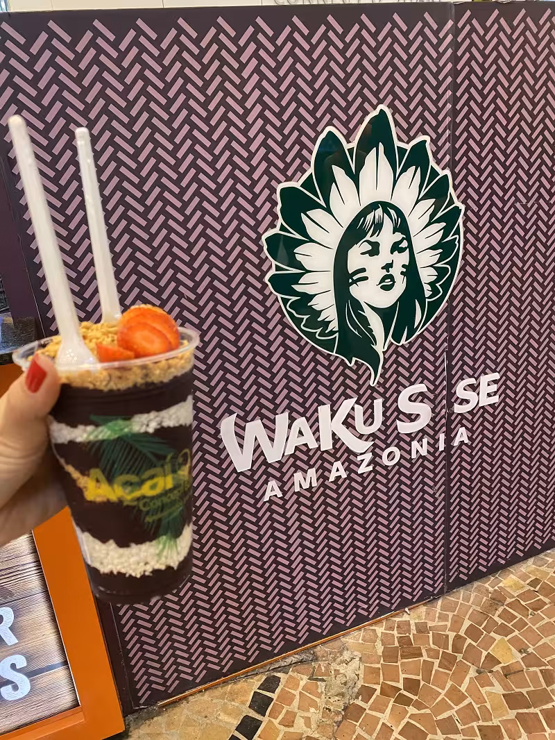 o melhor açaí da cidade. “Waku sese” significa uma saudação dos indígenas saterés-maués. O açaí estava muito gostoso, e, pela primeira vez, provei ele com farinha de tapioca. Ainda tem outras opções para acrescentar como xarope de guaraná, frutas fatiadas e granola.