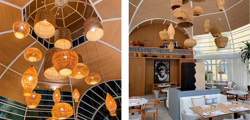 O restaurante é muito bonito, com um cúpula de ferro e vidro e lustres de palha dando o toque da cultura local.