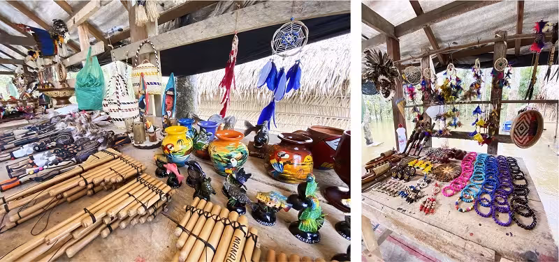 E também a , um espaço que incentiva a valorização da diversidade socioambiental na Amazônia. Um local de exposição e também de comercialização do artesanato amazonense, trabalha com o Controle de Qualidade e Origem Identificada dos produtos, ou seja, isso mostra o compromisso com a transparência na sustentabilidade do uso dos recursos naturais para a confecção dos objetos. Hoje comercializa peça de pelo menos 15 etnias e cerca de 10 associações e projetos socioambientais. Há diversas agências turísticas que fazem passeios o dia todo, porém como tínhamos somente um dia e queríamos somente dois passeios do pacote optamos por um privado. Assim fechamos o Encontro das Águas e Aldeia Indígena. Queria também ter visto as Vitórias Régias porém como choveu muito no dia anterior, o guia disse que não valia a pena. Contratamos a (92 99186-7133). Um motorista veio nos buscar no hotel e levar até o local de saída do barco. Navegamos por alguns minutos e chegamos no Encontro das Águas.