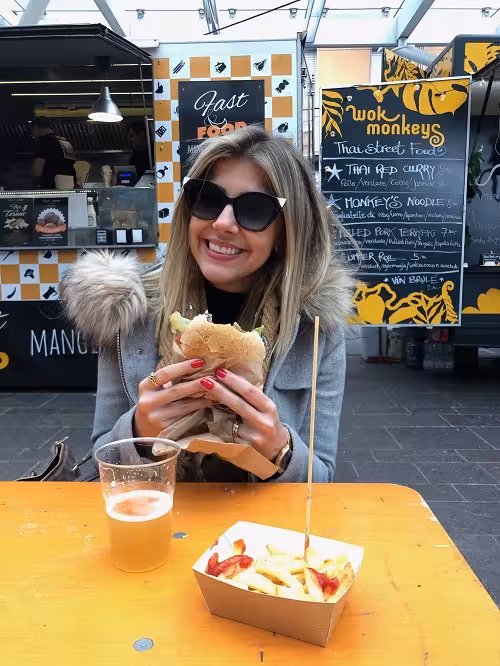 Eu ainda queria provar da culinária local, já que não tinha conseguido ir no tour do Prosciutto de Parma, o restaurante que eu tinha visto para ir estava lotado e com fila de espera, então por ali mesmo estavam acontecendo uma feira com diversos food trucks, com comida típicas e não típicas. Escolhemos um sanduíche de prosciutto de Parma com fritas e cerveja local.