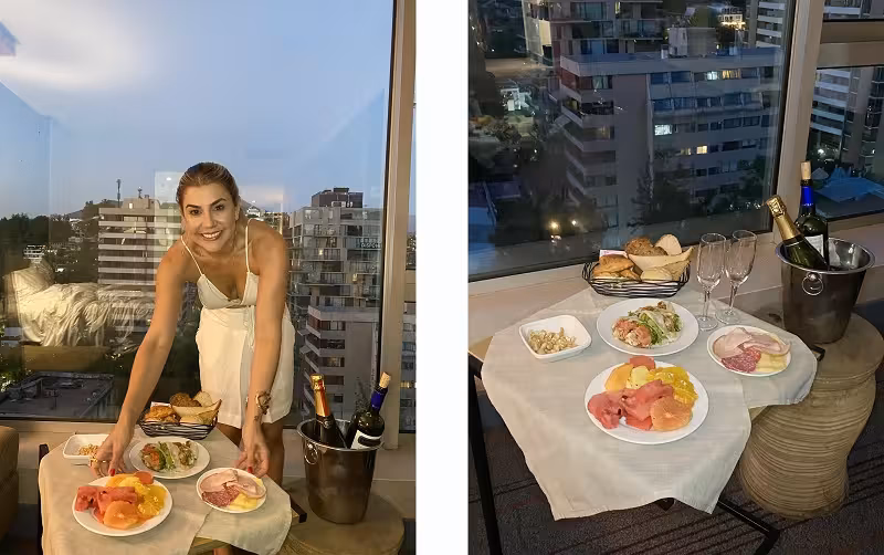 Nesse tempo em quarentena, o que fazer? Olhar pelo lado positivo sempre, estávamos com saúde. Pedimos comida pelo app e fizemos piquenique no quarto, com vinhos chilenos, claro, inclusive a ceia de Ano Novo.