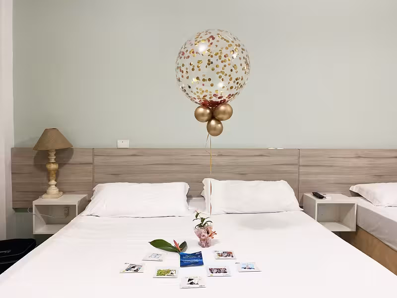 Minha ideia de carnaval esse ano era relaxar, então acabei não saindo do hotel pois ele tinha tudo que eu precisava. Já na chegada do quarto uma linda surpresa, fomos surpreendidos com fotos nossa na cama, balão e espumante de boas vindas. Pegamos um quarto de frente para o mar, amo o barulho das ondas para dormir.