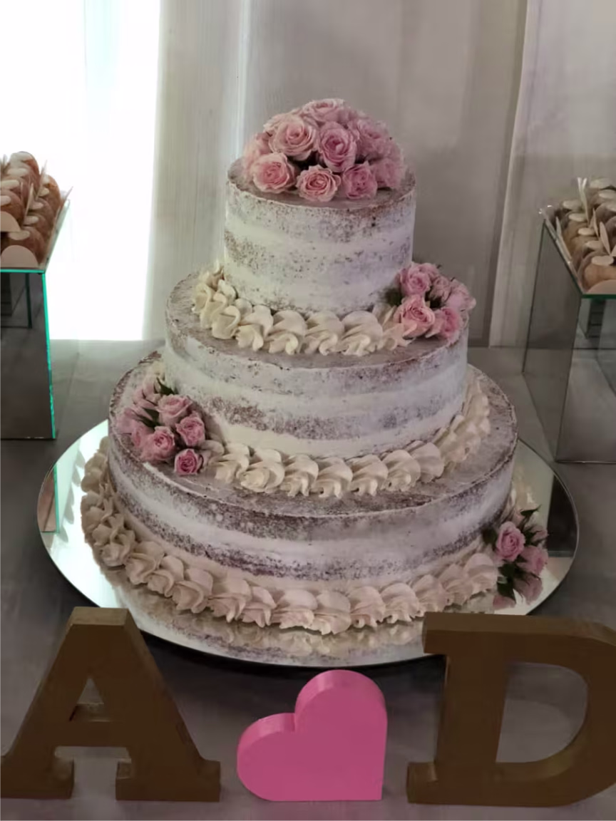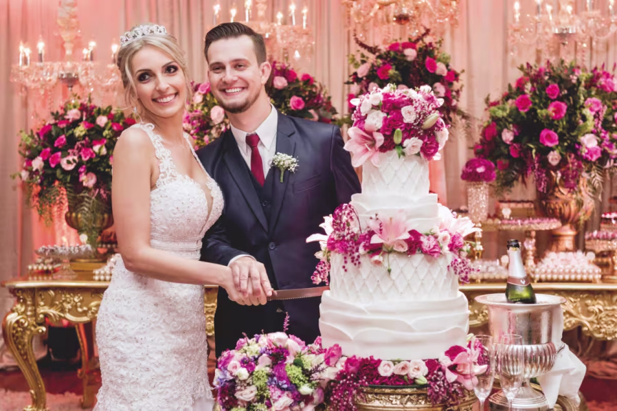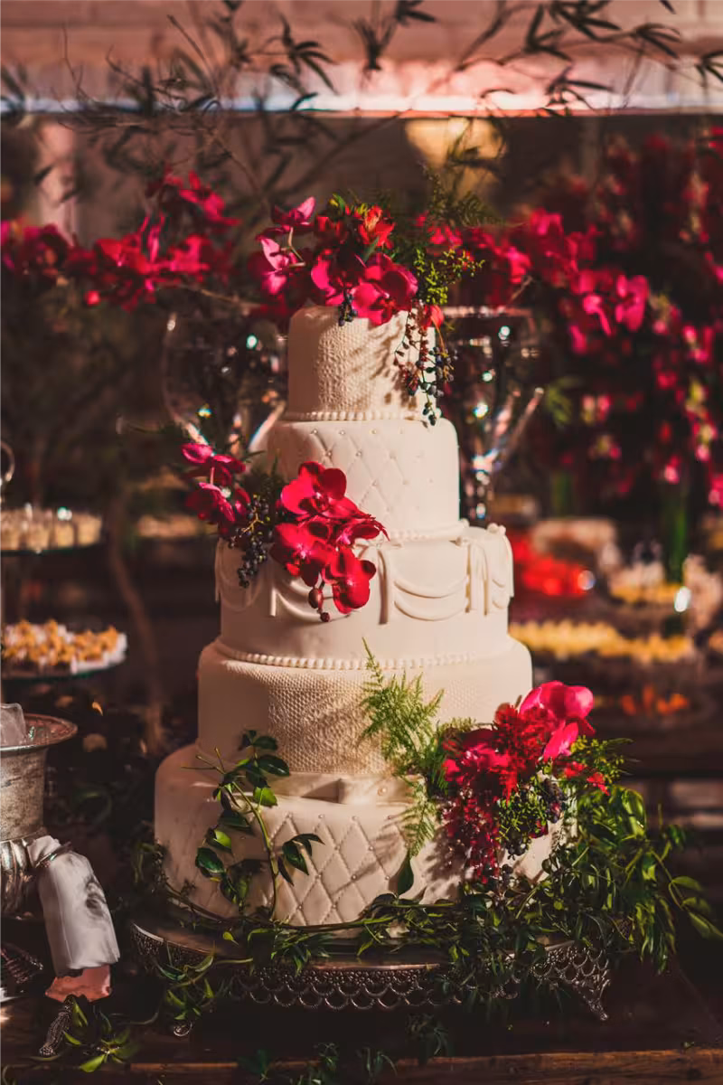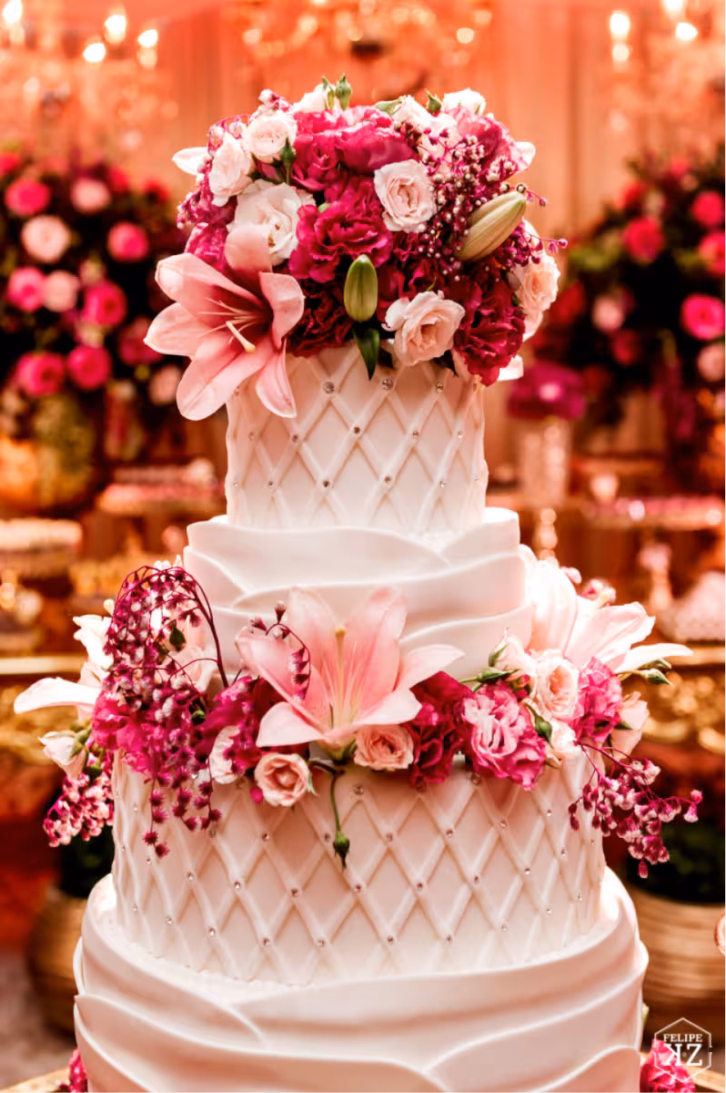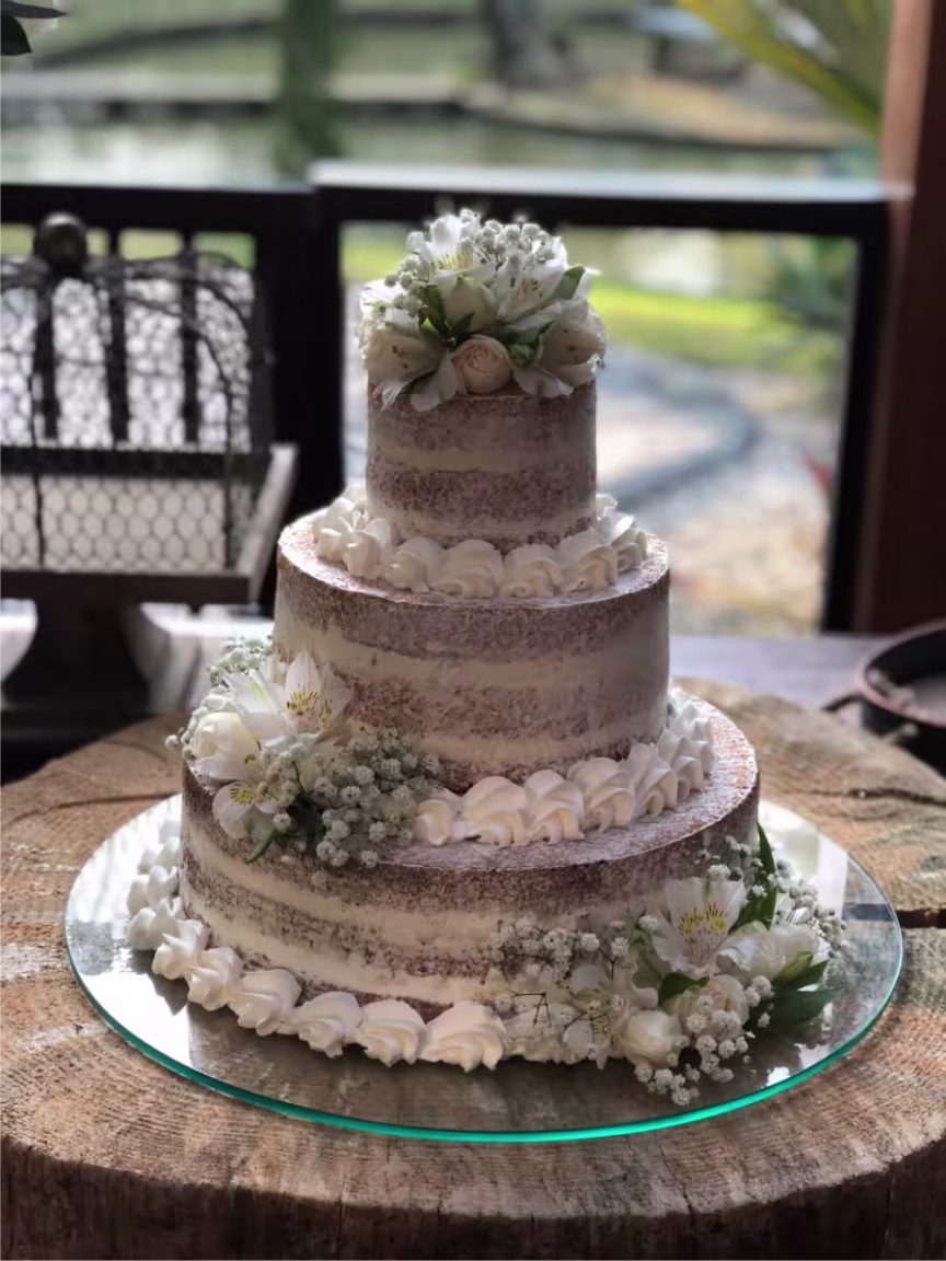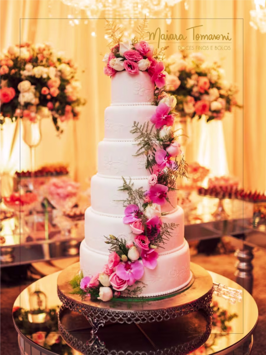 Outra grande especialidade de Maiara são os bolos para casamento. Atualmente, ela informa que está muito em alta os bolos cenográficos. Ou seja, feitos de isopor cobertos com pasta americana para apenas enfeitar a mesa de doces, com um tradicional que fica na cozinha para ser servido pelos garçons. “Virou uma tendência, porque ele dá para fazer do tamanho que quiser, deixa a mesa mais bonita até mesmo para fazer as fotos e também facilita na hora de servir o outro”, explica. Os semi nakeds também são preferência para casamentos. São os bolos com estilo mais rústico, mas que trazem toda sofisticação e beleza. Além disso, outro que está caindo no gosto dos noivos é o red velvet, um bolo de chocolate na coloração avermelhada, com recheio de cream cheese e chocolate branco. “Não tenho nem palavras quanto ao bolo. Superou todas as expectativas. Nunca imaginei que aquele bolo que eu havia escolhido a foto e enviado para ela, ficaria ainda mais perfeito. Ela teve toda preocupação em entrar em contato com pessoal da decoração e pedir as flores naturais para decorar. Sem falar nos detalhes a mais que não tinham na referência, mas ela colocou para ficar ainda mais a “nossa cara”. Isso mostra o quanto ela ama e se dedica ao que faz”, descreve a noiva Laila.