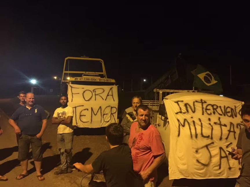 Manifestantes bloquearam a base de distribuição da WDCom, localizado na rua Artur Müller, bairro Limeira, desde 14h e seguem no local, em apoio às paralisações dos caminhoneiros pedindo "intervenção militar provisória para que sejam convocadas novas eleições".