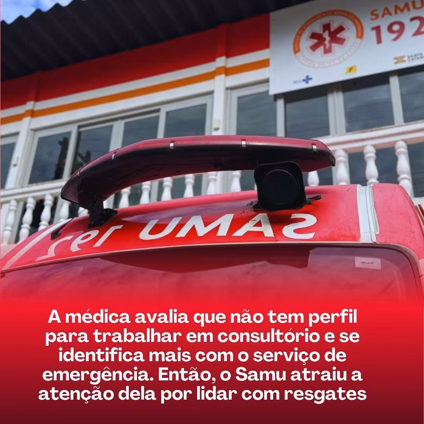 A médica avalia que não tem perfil para trabalhar em consultório e se identifica mais com o serviço de emergência. Então, o Samu atraiu a atenção dela por lidar com resgates.