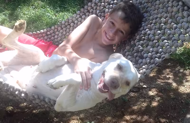 Luiz e Fiona são amigos inseparáveis. Eles se divertem juntos no pomar da casa da família, jogam frisbee e brincam de pega-pega. Há um ano, depois da cachorrinho de Luiz morrer de velhice, Fiona foi adotada por meio da Associação Brusquense de Proteção aos Animais (Acapra). Mesmo desajeitada e sem noção da força que tem – são 37 quilos -, Fiona é uma típica labradora e adora abraçar e mostrar o seu afeto pelo seu tutor mirim e por toda a família Dutra Faria. Na casa ainda há outros animais: duas calopsitas, dois periquitos, um gato e mais um cachorro. É muito amor animal neste lar!