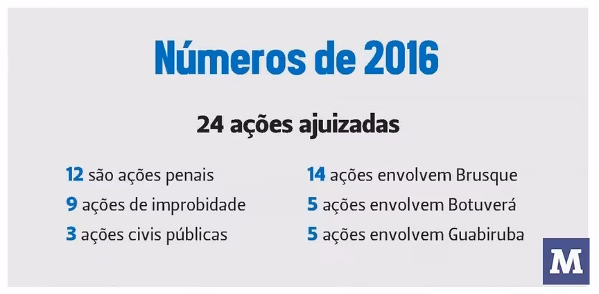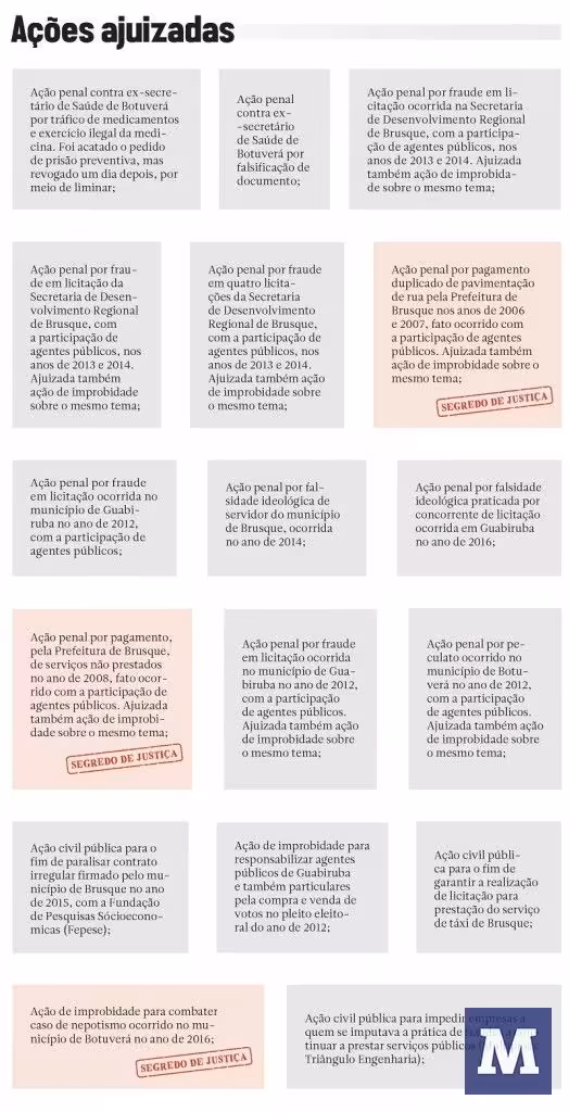 O Ministério Público de Santa Catarina (MP-SC) ajuizou, neste ano, 24 ações judiciais envolvendo ilegalidades e crimes cometidos por agentes públicos dos três municípios da Comarca: Brusque, Guabiruba e Botuverá.