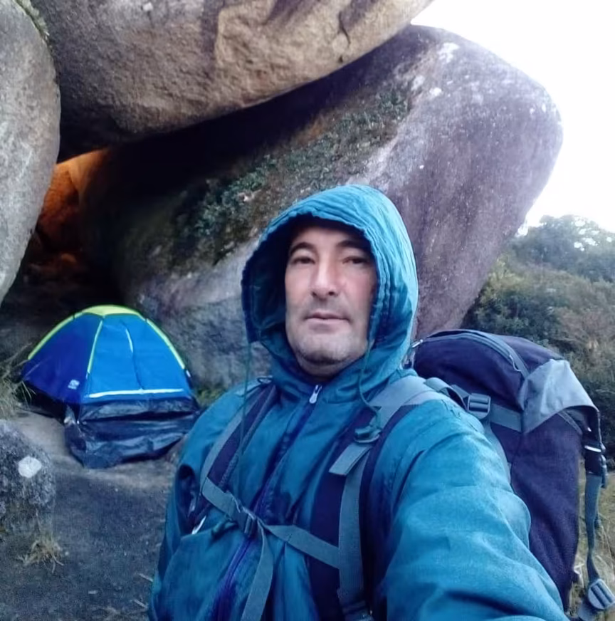 Galvan descreve a jornada pela trilha na mata, enfrentando o gélido ar invernal do trajeto. No cume, entre as grandiosas formações rochosas esculpidas pela natureza, ele montou sua tenda, preparando-se para passar a noite nas alturas.