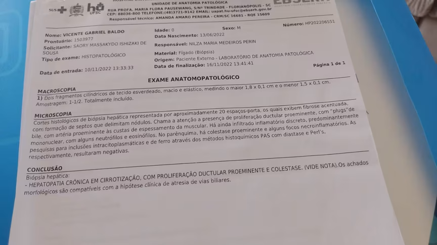 Três pedidos de encaminhamento para Florianópolis foram negados por não haver piora no quadro dele. A mãe conta que ele recebeu alta com a desconfiança de hepatite medicamentosa.