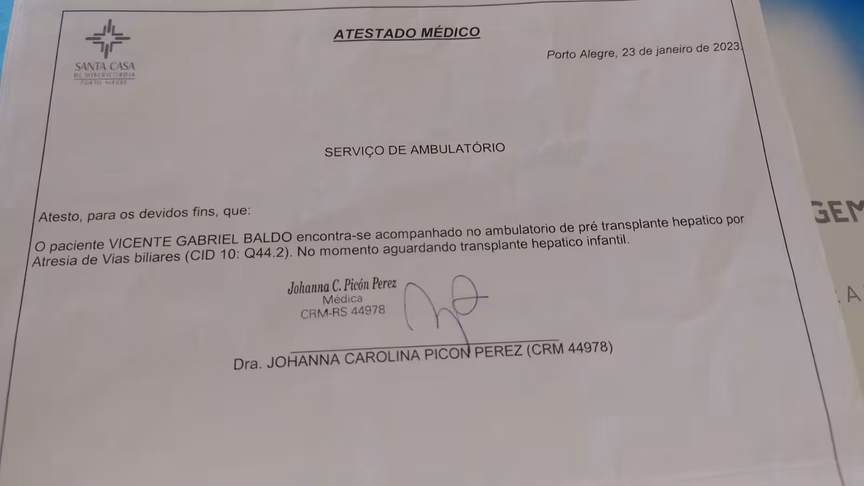 Os dois ficaram uma semana em Porto Alegre até o diagnóstico ser confirmado. O tio paterno de Vicente tentou ser doador, mas não conseguiu. Por conta disso, Vicente está na fila para receber um fígado de doadores mortos.