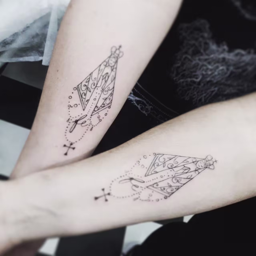 Betti e Geovana tatuaram em seus braços uma imagem de Nossa Senhora para lembrar da peregrinação.
