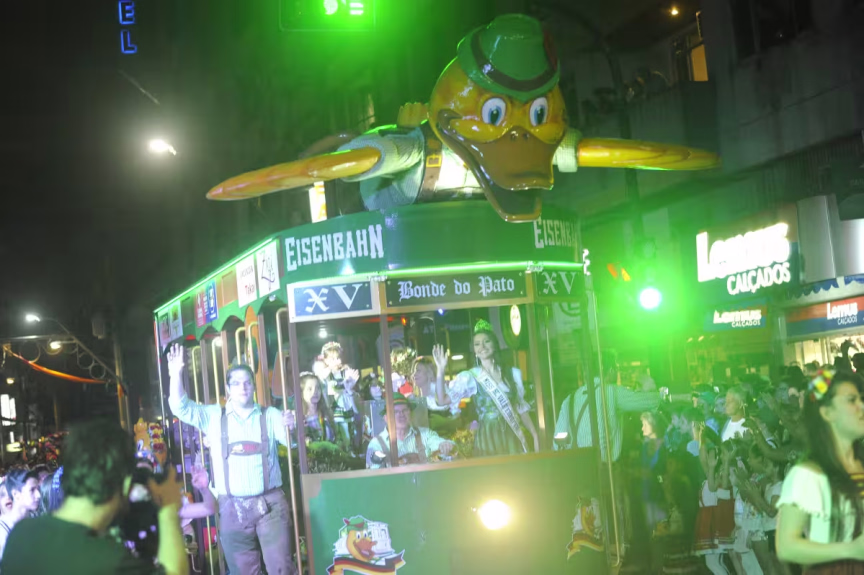 A avenida Cônsul Carlos Renaux foi tomada por uma multidão no começo da noite desta quinta-feira, 5. Crianças, jovens e idosos, embalados por músicas germânicas, desfilaram pelo Centro de Brusque, dando início à 32ª edição da Festa Nacional do Marreco, a Fenarreco.