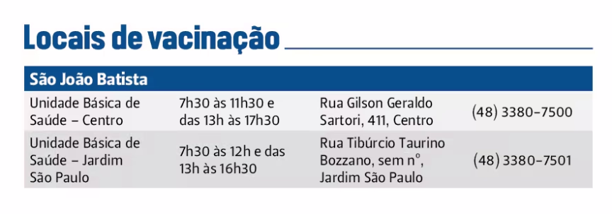 No município, a vacinação ocorre na Policlínica, na rua 10 de Junho, 195, no Centro, das 7h às 18h. Mais informações pelo telefone (47) 3308-3101.