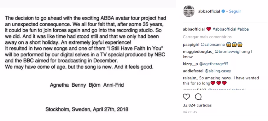 Imagino que o ABBA não estivesse entre os grupos preferidos da nossa cena punk local, a não ser nos guilty pleasures da meninada... Mas, mesmo assim, há que se trazer para cá a notícia bombástica da semana: o quarteto sueco lançou duas músicas novas – e uma delas, "I Still Have Faith in You" vai ganhar uma performance digital em um especial da BBC que será exibido no final do ano.