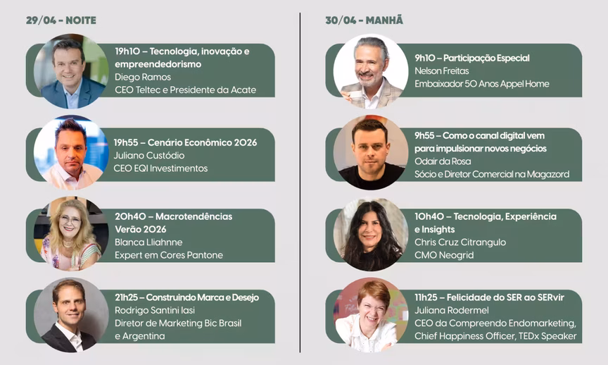 Entre os nomes confirmados está Chris Cruz Citrangulo, executiva com sólida trajetória em empresas como Unilever, Nestlé, Carrefour e GPA. Atualmente CMO da Neogrid, Chris sobe ao palco no dia 30 de abril, às 10h40, para compartilhar sua visão sobre tecnologia, experiência do consumidor e as transformações no consumo. Com mais de três décadas de atuação estratégica e coautora do livro "Mulheres do Varejo", ela é referência em liderança, inovação e desenvolvimento de marcas. No dia anterior, Rodrigo Santini Iasi, diretor de marketing da BIC para Brasil e Argentina, traz ao público uma reflexão sobre construção de marca e desejo, a partir das 21h25. Com passagens por empresas como Nike, Havaianas, Johnson & Johnson e ampla atuação nos mercados da América Latina e Europa, Rodrigo traz ao Summit um olhar estratégico sobre como se manter relevante em meio às mudanças constantes do comportamento do consumidor. Além de Chris e Rodrigo, o Appel Summit contará com palestras de Blanca Lliahnne, especialista em cores da Pantone, que abordará as Macrotendências para o Verão 2026, Diego Ramos, CEO da Teltec e presidente da ACATE, que trará uma palestra sobre tecnologia, inovação e empreendedorismo, entre outros grandes nomes. Segundo Rafael Berwanger, diretor comercial da Appel, a intenção é proporcionar uma experiência completa: “buscamos nomes que realmente pudessem contribuir com conteúdo prático e estratégico, equilibrando diferentes áreas do conhecimento”, afirma.